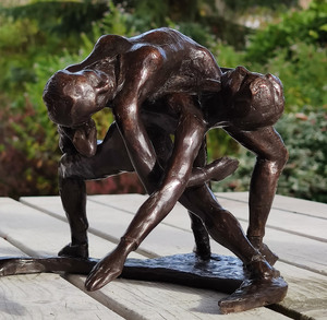 Opmerkingen/notice: Het beeldje van deze dansers maakte ik nadat ik een voorstelling van Introdans had gezien, deze pose kwam voor in een van de dansen. In de periode van het maken van de naakten, vond ik het ook erg leuk om dansers te maken. Het menselijk lichaam was interessant om vorm te geven om vormen en beweging te creëren. De patinering kan de ene keer iets donkerder zijn, de andere keer wat lichter.
