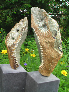 Notice: Double sculptures. The stones are worked with the pointed chisel, partly polished + partly rough stone left to show the beauty of these stones by means of adding contrast to the processing. I thought it was nice to leave the basic shape of the stone intact. The wind can sing between the stones and through the openings in the stone, making the song.