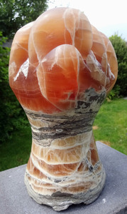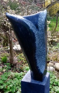 Opmerkingen: Dit beeld is gemaakt als vervolg op diverse blad & bloemvormen. De steen heeft sterk afwisselende lageen en een grote variatie in kleur van licht naar donker. Ik vond het mooi om terugkerende vormen te maken in de steen en om het afwisselend te bewerken en te polijsten.