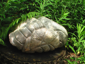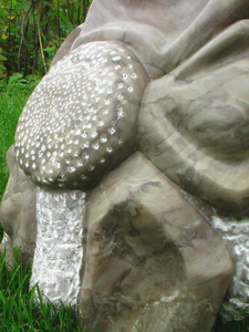 This stone has many different colors in it - green, brown, white, red, which makes it very special. I worked out leaf shapes and grain lines on both the top and bottom. The grain lines are made in it and not on it, so that they become a kind of gutters from which the rainwater can run off.