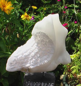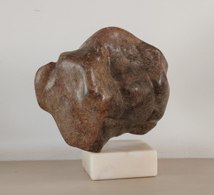 Opmerkingen: De stenen zijn bewerkt met de puntbeitel, gedeeltelijk gepolijst + gedeeltelijk ruwe steen gelaten om het mooie van deze stenen te laten zien d.m.v. het aanbrengen van contrast in de bewerking. Ik vond het mooi de basisvorm van de steen heel te laten. Een deel is bewerkt, een deel is gepolijst, een deel (aan de achterzijde) is onbewerkt gelaten. De voet van roze marmer is volledig gepolijst.