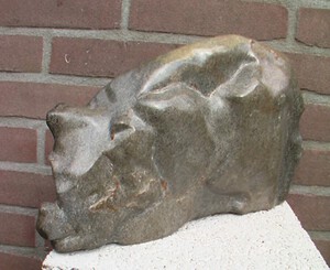 Opmerking: Dit beeld is intuitief gemaakt naar de vorm van de steen - organisch. Het beeld zat er al in en ik heb het eruit gehaald. Ik zie in de vormen een neushoorn. Aan de ene zijde is de steen lichter van kleur, aan de andere zijde donkerder. In de steen zitten bruinrode ijzererts laagjes.
